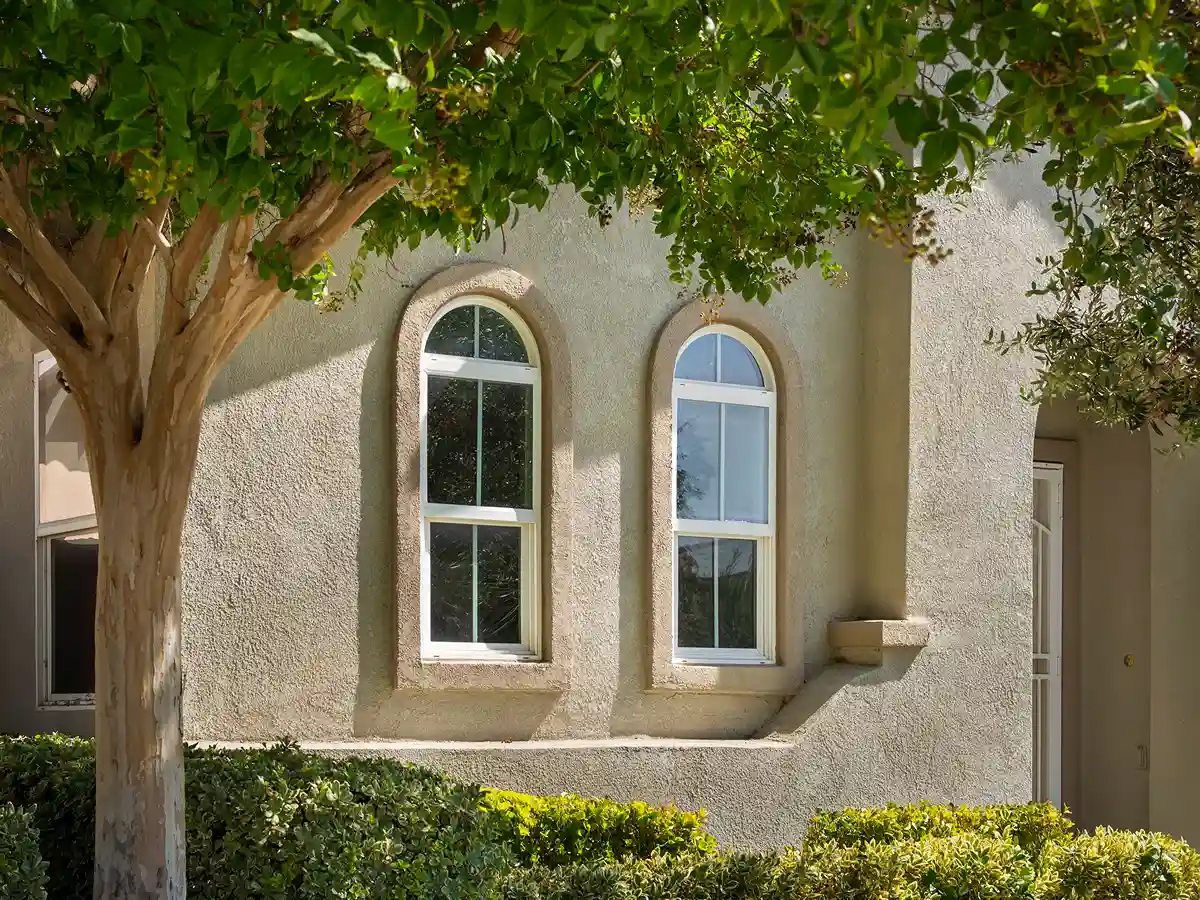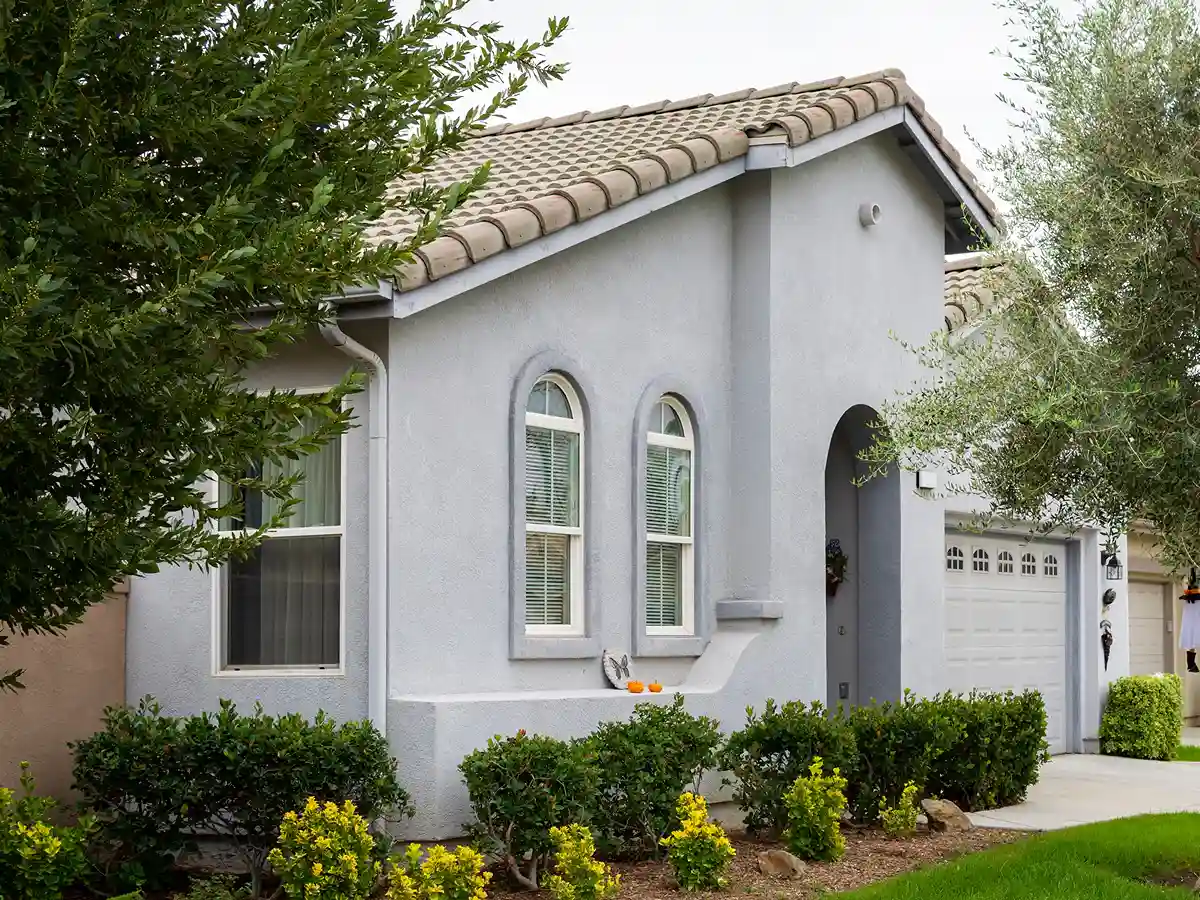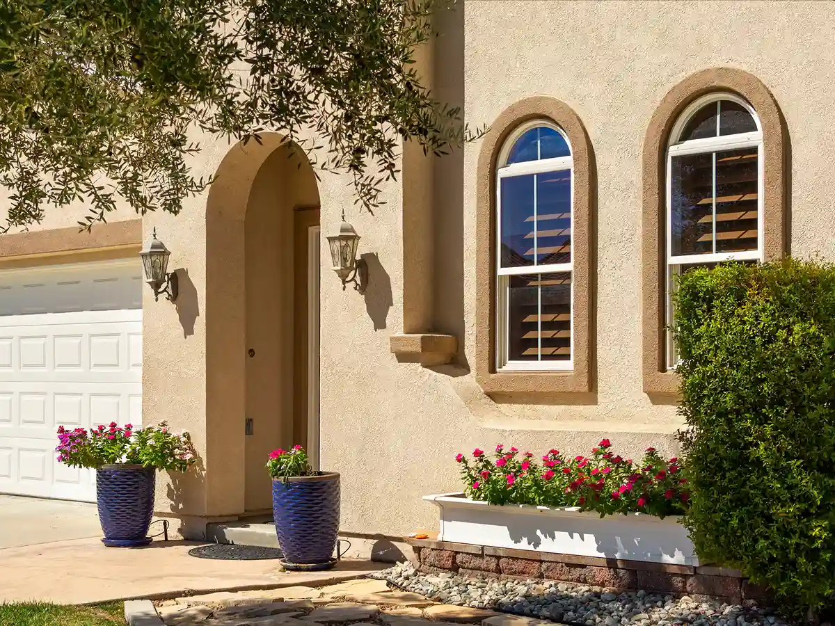 Close up view of a modern house featuring a durable tan textured stucco exterior finish with clean white window frames and a sunny backyard in the background.
