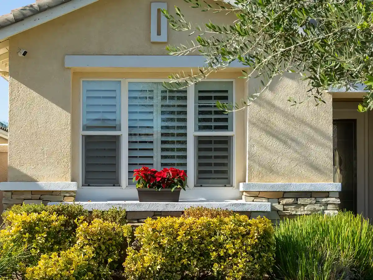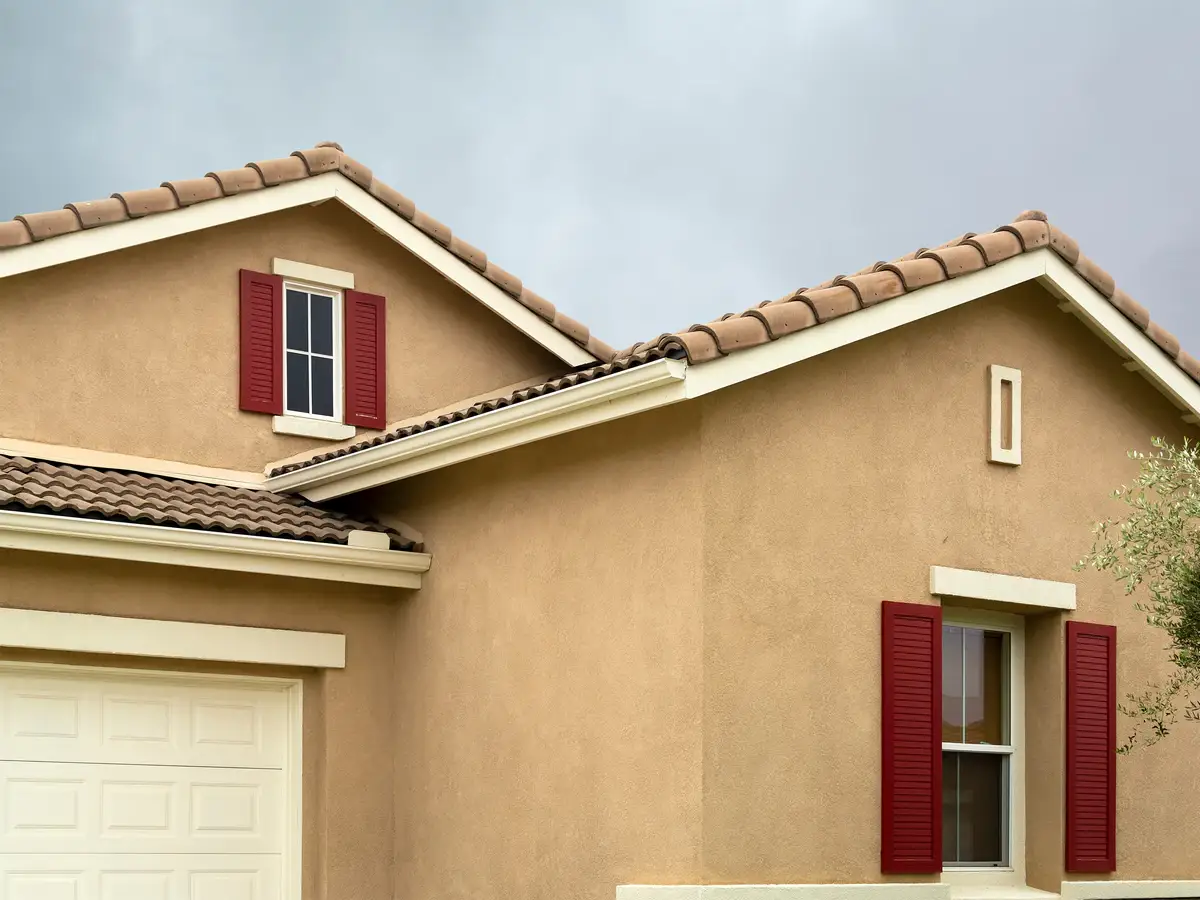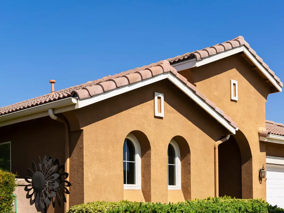 Close up view of a modern house featuring a durable tan textured stucco exterior finish with clean white window frames and a sunny backyard in the background.